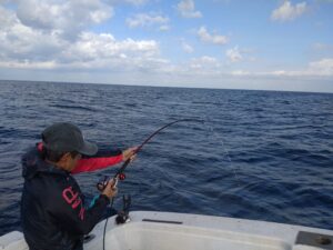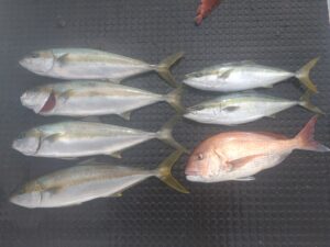 友達と 南西の風で今日は本潮に変わっていました。直ぐにヒラマサやハマチが食って来ましたが、上潮が段々と速くなりアタリも止まりました。雨模様となったので帰港しました。