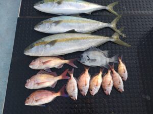 マダイ32〜41cm3匹 ヒラマサ83cm.87cm2匹 メジロ82cm サンバソウ36cm コダイ6匹