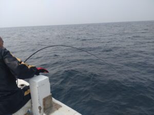 友達と 南西の風で今日は本潮に変わっていました。直ぐにヒラマサやハマチが食って来ましたが、上潮が段々と速くなりアタリも止まりました。雨模様となったので帰港しました。
