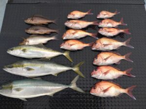 南の風がやや強くけっこう速いサカ潮でした。午前中気配無く、午後より浅場に移動して小型マダイに遊んでもらえました。なんとかヒラマサの顔も見れました。