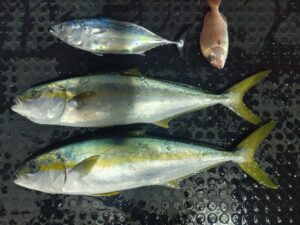友達と 南西の風で今日は本潮に変わっていました。直ぐにヒラマサやハマチが食って来ましたが、上潮が段々と速くなりアタリも止まりました。雨模様となったので帰港しました。