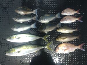 南の風がやや強くけっこう速いサカ潮でした。午前中気配無く、午後より浅場に移動して小型マダイに遊んでもらえました。なんとかヒラマサの顔も見れました。