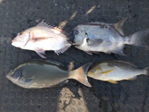 マダイ32〜41cm3匹 ヒラマサ83cm.87cm2匹 メジロ82cm サンバソウ36cm コダイ6匹