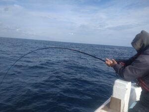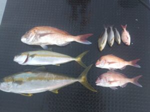 南の風でゆっくりとしたサカ潮でした。午前中大型マダイやヒラマサがバタバタと当たりましたが、午後より渋くなりました。サカ潮模様ばかりで食いは渋くなるばかりです。