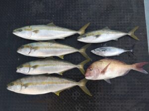 東の風が強くサカ潮がゆっくりと動いていました。魚の食いは渋い中、昼前にヒラマサがバタバタとあたって来ましたが、残念ながら1匹しか取れませんでした。中々厳しいです